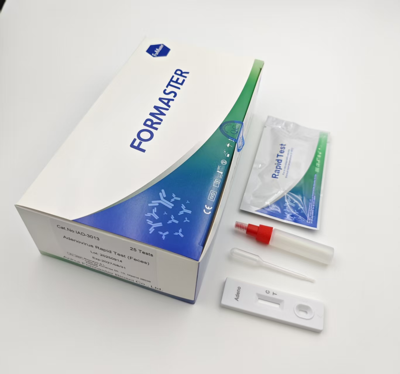 The Adenovirus Rapid Test (Feces) is a sandwich solid phase immunochromatographic assay. To perform the test, an aliquot of diluted stool sample is added to the sample well of the test Device. The sample flows through a label pad containing adenovirus antibody coupled to red-colored colloidal gold. If the sample contains adenovirus antigens, the antigen will bind to the antibody coated on the colloidal gold particles to form antigen antibody-gold complexes. These complexes move on the nitrocellulose membrane by capillary action toward the test line region on which adenovirus specific antibodies are immobilized. As the complexes reach the test line, they will bind to the antibody on the membrane in the form of a line. A second red control line will always appear in the result window to indicate that the test has been correctly performed and the test device functions properly. If adenovirus antigen is not present or lower than the detection limit of the test, only the control line will be visible. If the control line does not develop the test is invalid.