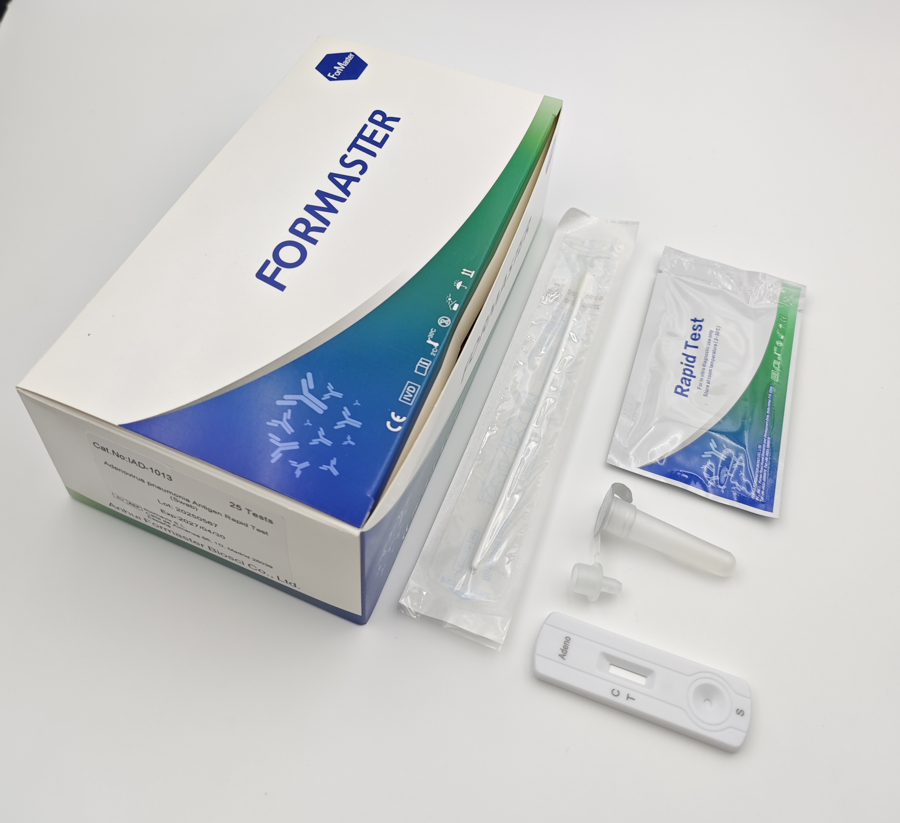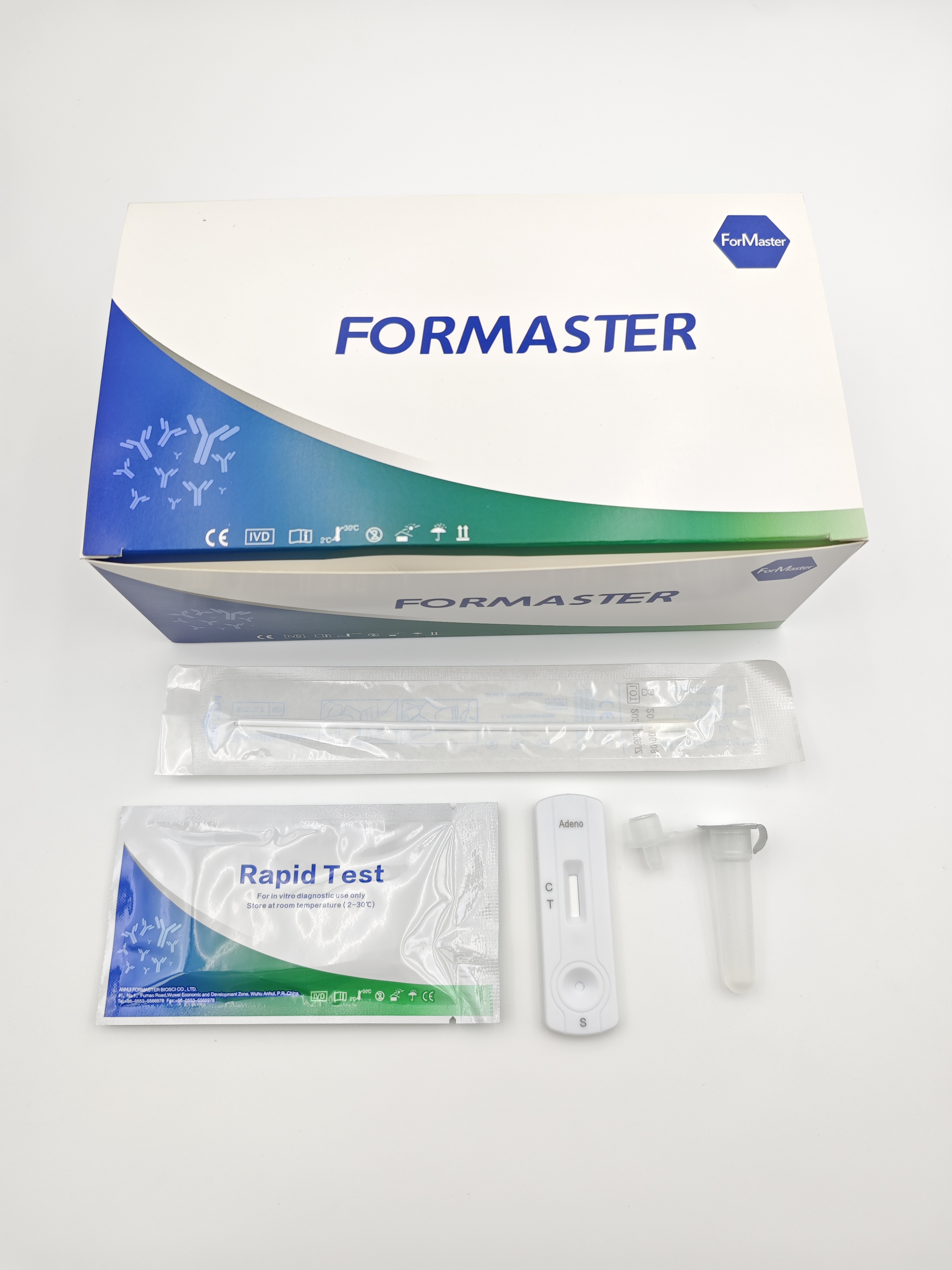 The immunochromatographic test utilizes a pair of Adenovirus-specific monoclonal antibodies. An extract is first prepared by suspension of the specimen in the provided extraction buffer solution. The buffer containing the extracted specimen is then added to the devices sample well. The reaction between a positive sample and the colored particle-conjugated antibody will form a complex that migrates along the membrane. An immobilized capture antibody will form a colored line at the S (specimen) area upon reacting with the colored complex. An internal control line C (control) area is built in to assure that the test has been carried out correctly. Whether the sample contains the virus or not, the solution continues to migrate to encounter another reagent (an anti-mouse IgG antibody) that binds the remaining conjugates, thereby producing a red line on the region C.