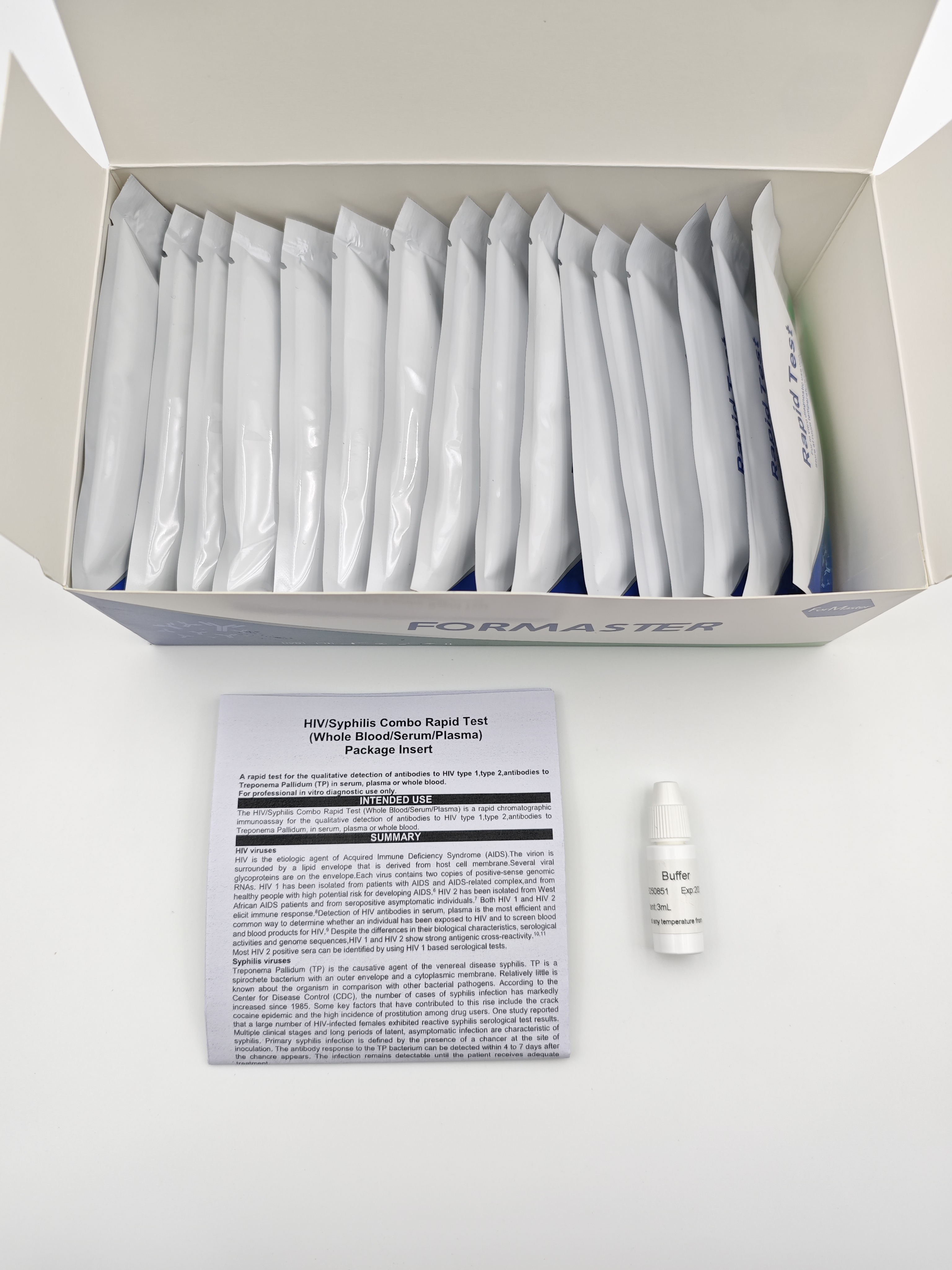 The HIV 1.2 Rapid Test item The HIV 1.2 Rapid Test item is a qualitative,membrane based immunoassay for the detection of antibodies to HIV 1.2 in serum, plasma or whole blood.The membrane is pre-coated with recombinant HIV antigens.During testing,the serum or plasma specimen reacts with HIV antigen coated particles in the test Device.The mixture then migrates upward on the membrane chromatographically by capillary action and reacts with recombinant HIV antigen on the membrane in the test line region.If the specimen contains antibodies to HIV 1 and/or HIV 2, a colored line will appear in the test line region,indicating a positive result. If the specimen does not contain HIV 1 and/or HIV 2 antibodies,a colored line will not appear in the test line region, indicating a negative result. To serve as a procedural control, a colored line will always appear in the control line region,indicating that proper volume of specimen has been added and membrane wicking has occurred. The Syphilis Rapid Test item The Syphilis Rapid Test item is a qualitative membrane strip based immunoassay for the detection of TP antibodies (IgG and IgM) in serum, plasma or whole blood.In this test procedure, recombinant syphilis antigen is immobilized in the test line region of the strip.After a Serum/ Plasma specimen is placed in the specimen well, it reacts with syphilis antigen coated particles that have been applied to the specimen pad.This mixture migrates chromatographically along the length of the test strip and interacts with the immobilized syphilis antigen.If the specimen contains TP antibodies, a colored line will appear in the test line region indicating a positive result.The double antigen test format can detect both IgM and IgG in specimens.If the specimen does not contain TP antibodies,a colored line will not appear in this region indicating a negative result.To serve as a procedural control,a colored line will always appear at the control line region indicating that proper volume of specimen has been added and membrane wicking has occurred.