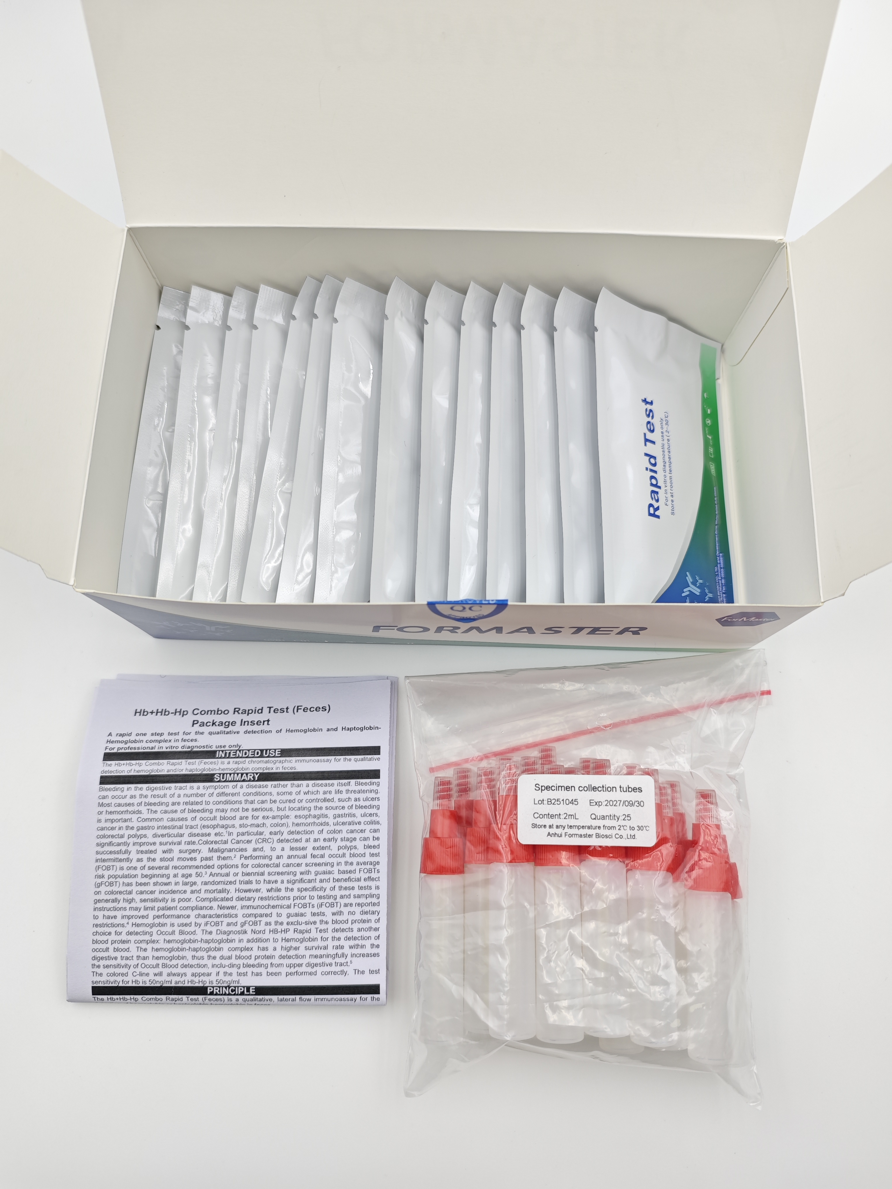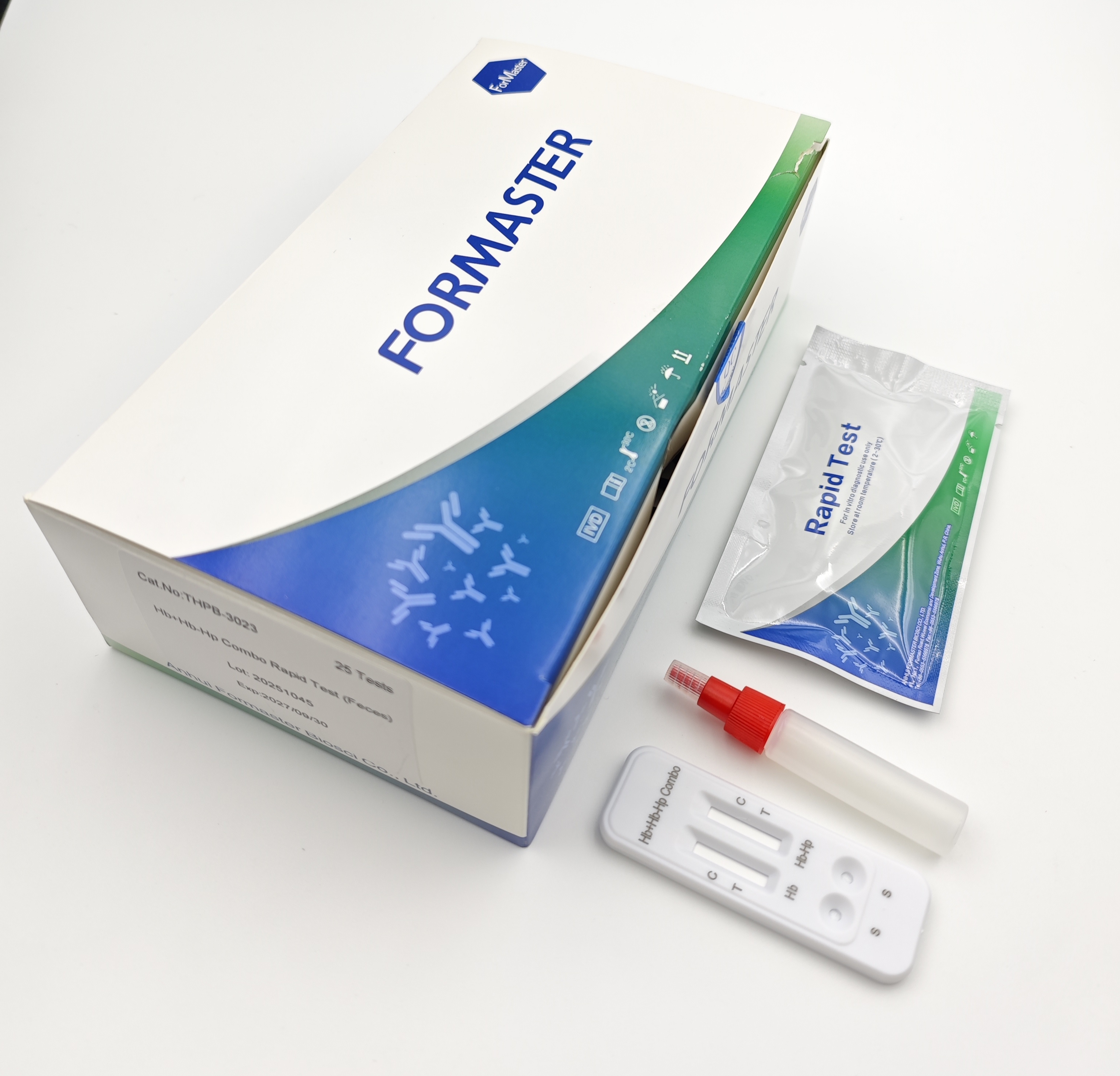 The Hb+Hb-Hp Combo Rapid Test (Feces) is a qualitative, lateral flow immunoassay for the detection of hemoglobin or haptoglobin-hemoglobin in feces. The Hb Rapid Test The membrane is precoated with anti-hemoglobin antibody on the test line region of the test. During testing, the specimen reacts with the particle coated with anti-hemoglobin antibody. The mixture migrates upward on the membrane chromatographically by capillary action to react with anti-hemoglobin antibody on the membrane and generate a colored line. The presence of this colored line in the test line region indicates a positive result, while its absence indicates a negative result. To serve as a procedural control, a colored line will always appear in the control line region, indicating that the proper volume of specimen has been added and membrane wicking has occurred. The Hb-Hp Rapid Test The membrane is precoated with anti-haptoglobin antibody on the test line region of the test. During testing, the specimen reacts with the particle coated with anti-hemoglobin antibody. The mixture migrates upward on the membrane chromatographically by capillary action to react with anti-haptoglobin antibody on the membrane and generate a colored line. The presence of this colored line in the test line region indicates a positive result, while its absence indicates a negative result. To serve as a procedural control, a colored line will always appear in the control line region, indicating that the proper volume of specimen has been added and membrane wicking has occurred.