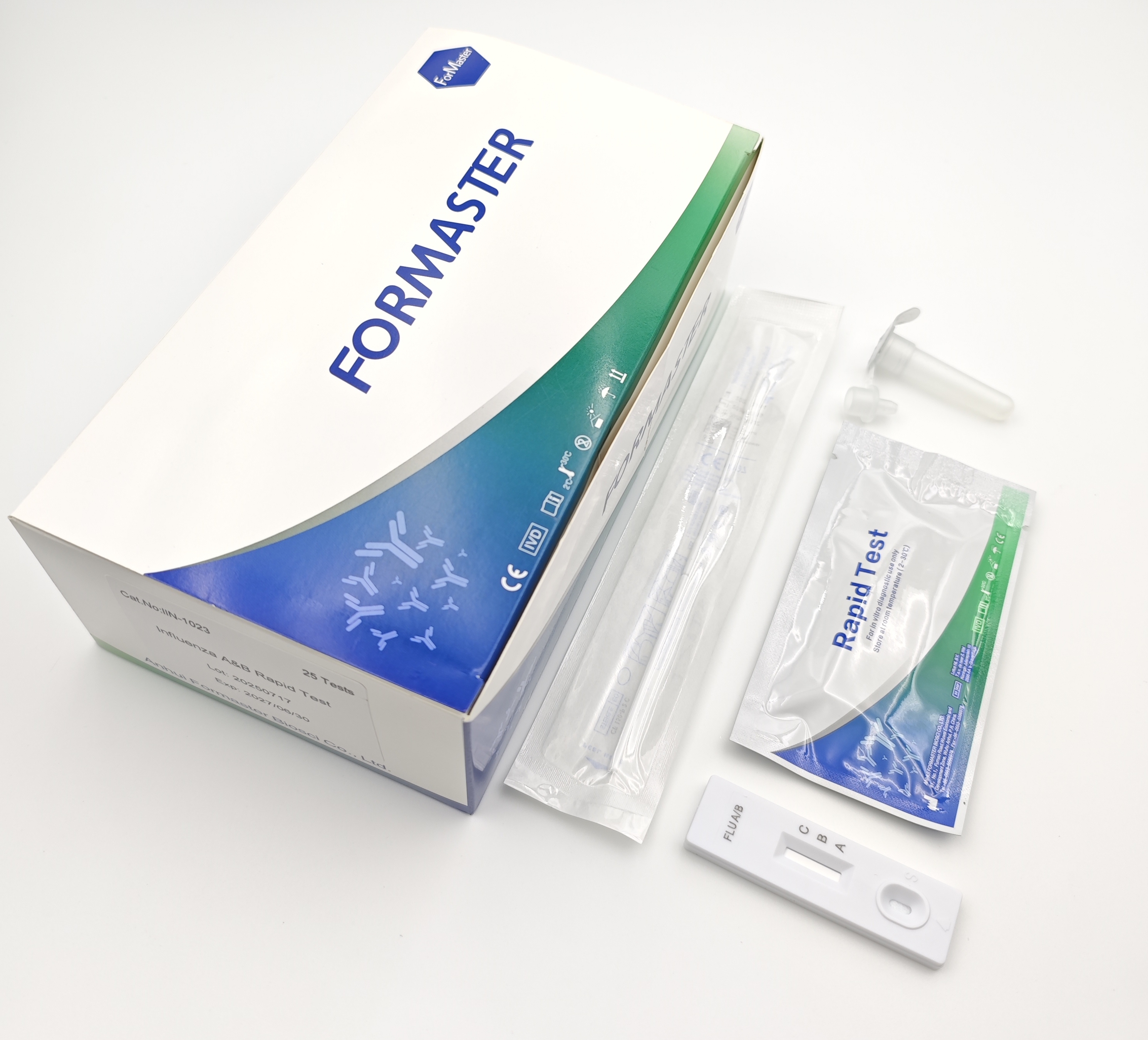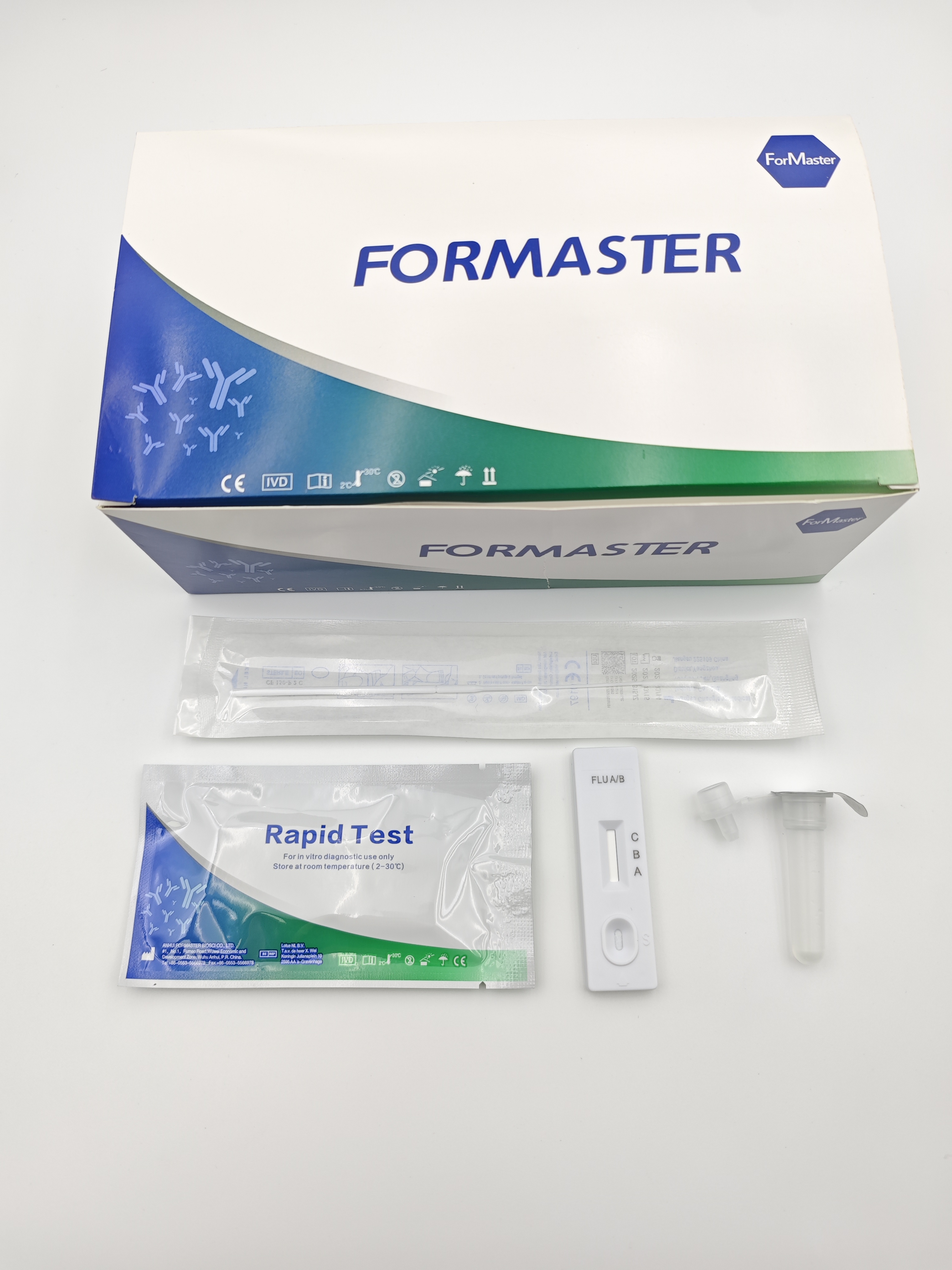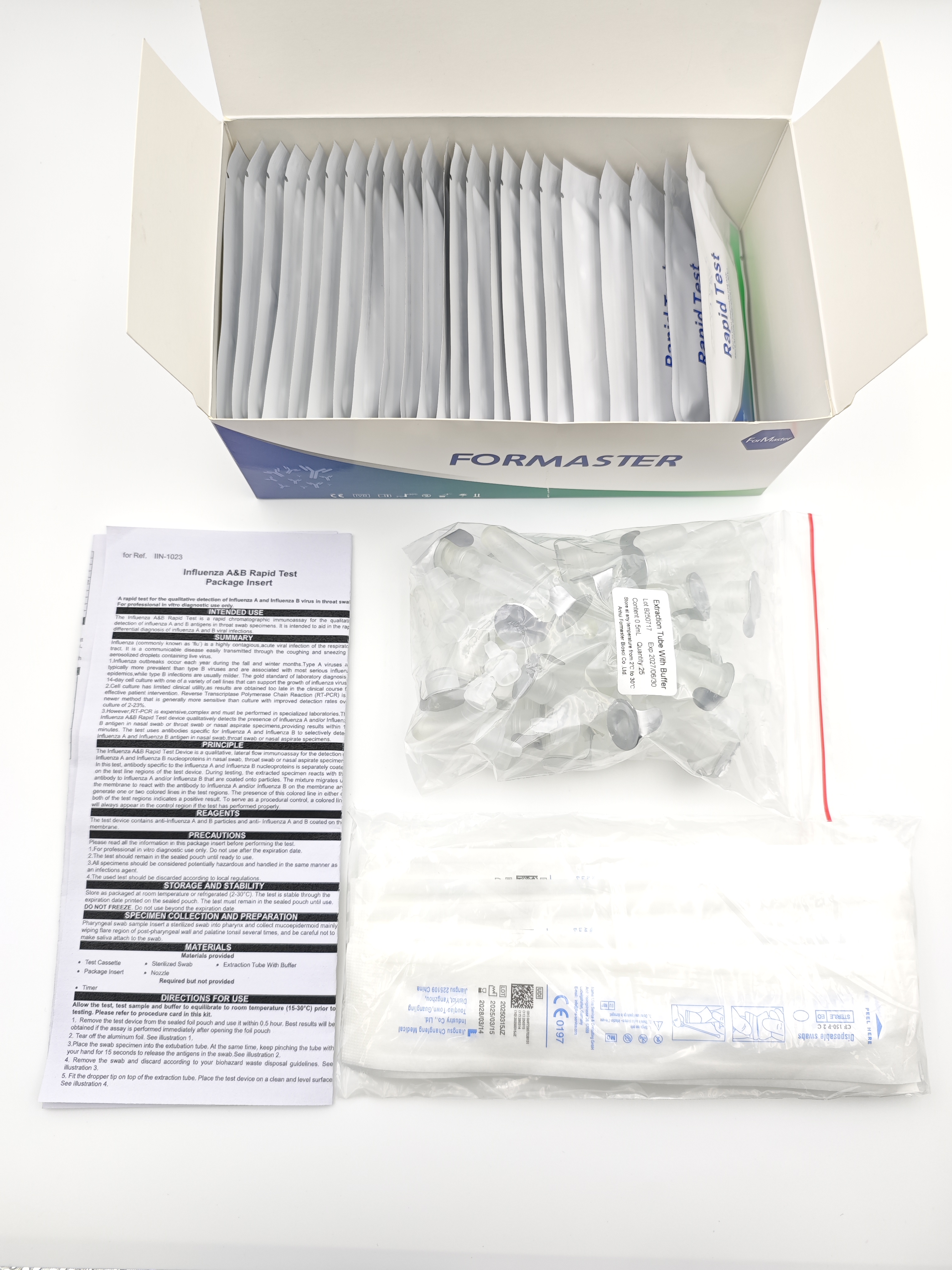 The Influenza A&B Rapid Test is a rapid chromatographic immunoassay for the qualitative detection of influenza A and B antigens in throat swab specimens. It is intended to aid in the rapid differential diagnosis of influenza A and B viral infections.
