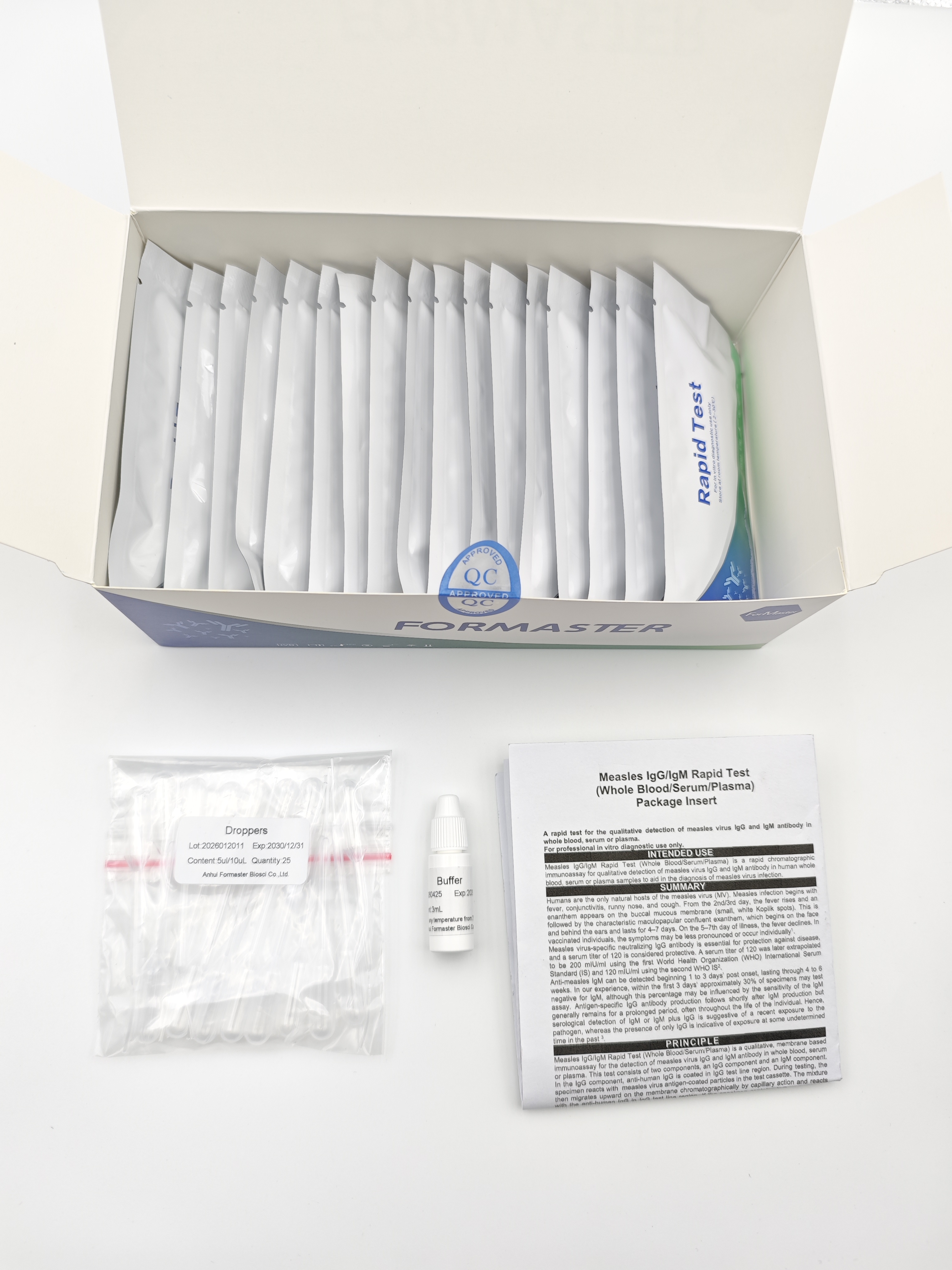 The Adenovirus Rapid Test (Feces) is a sandwich solid phase immunochromatographic assay. To perform the test, an aliquot of diluted stool sample is added to the sample well of the test Device. The sample flows through a label pad containing adenovirus antibody coupled to red-colored colloidal gold. If the sample contains adenovirus antigens, the antigen will bind to the antibody coated on the colloidal gold particles to form antigen antibody-gold complexes. These complexes move on the nitrocellulose membrane by capillary action toward the test line region on which adenovirus specific antibodies are immobilized. As the complexes reach the test line, they will bind to the antibody on the membrane in the form of a line. A second red control line will always appear in the result window to indicate that the test has been correctly performed and the test device functions properly. If adenovirus antigen is not present or lower than the detection limit of the test, only the control line will be visible. If the control line does not develop the test is invalid.