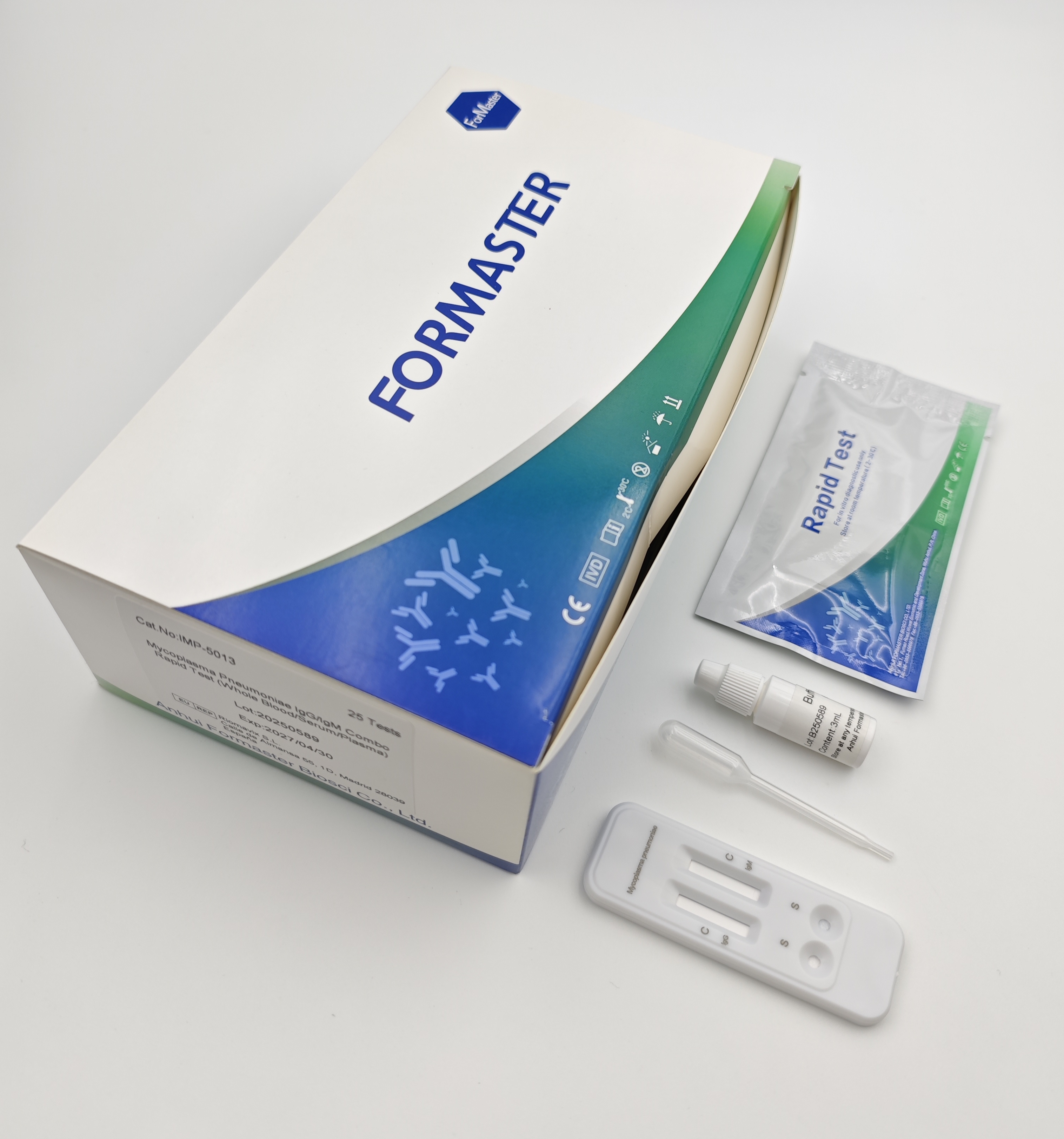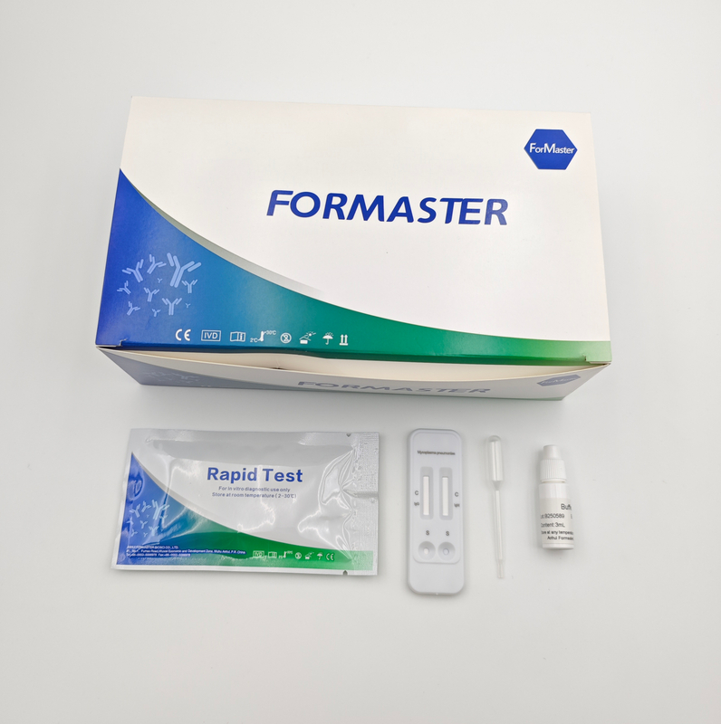 The Mycoplasma Pneumoniae IgG/IgM Combo Rapid Test (Whole Blood/Serum/Plasma) is a qualitative membrane based immunoassay for the detection of Mycoplasma pneumoniae IgG and IgM antibodies in whole blood, serum, or plasma. In this test procedure, anti-human IgG or IgM is immobilized in the test line region of the test. After specimen is added to the specimen well of the device, it reacts with Mycoplasma pneumoniae antigen coated particles in the test. This mixture migrates chromatographically along the length of the test and interacts with the immobilized anti-human IgG or IgM. If the specimen contains Mycoplasma pneumoniae IgG and/or IgM antibodies, a colored line will appear in the test line region indicating a positive result. If the specimen does not contain Mycoplasma pneumoniae antibodies, a colored line will not appear in this region indicating a negative result. To serve as a procedural control, a colored line will always appear in the control line region, indicating that proper volume of specimen has been added and membrane wicking has occurred.