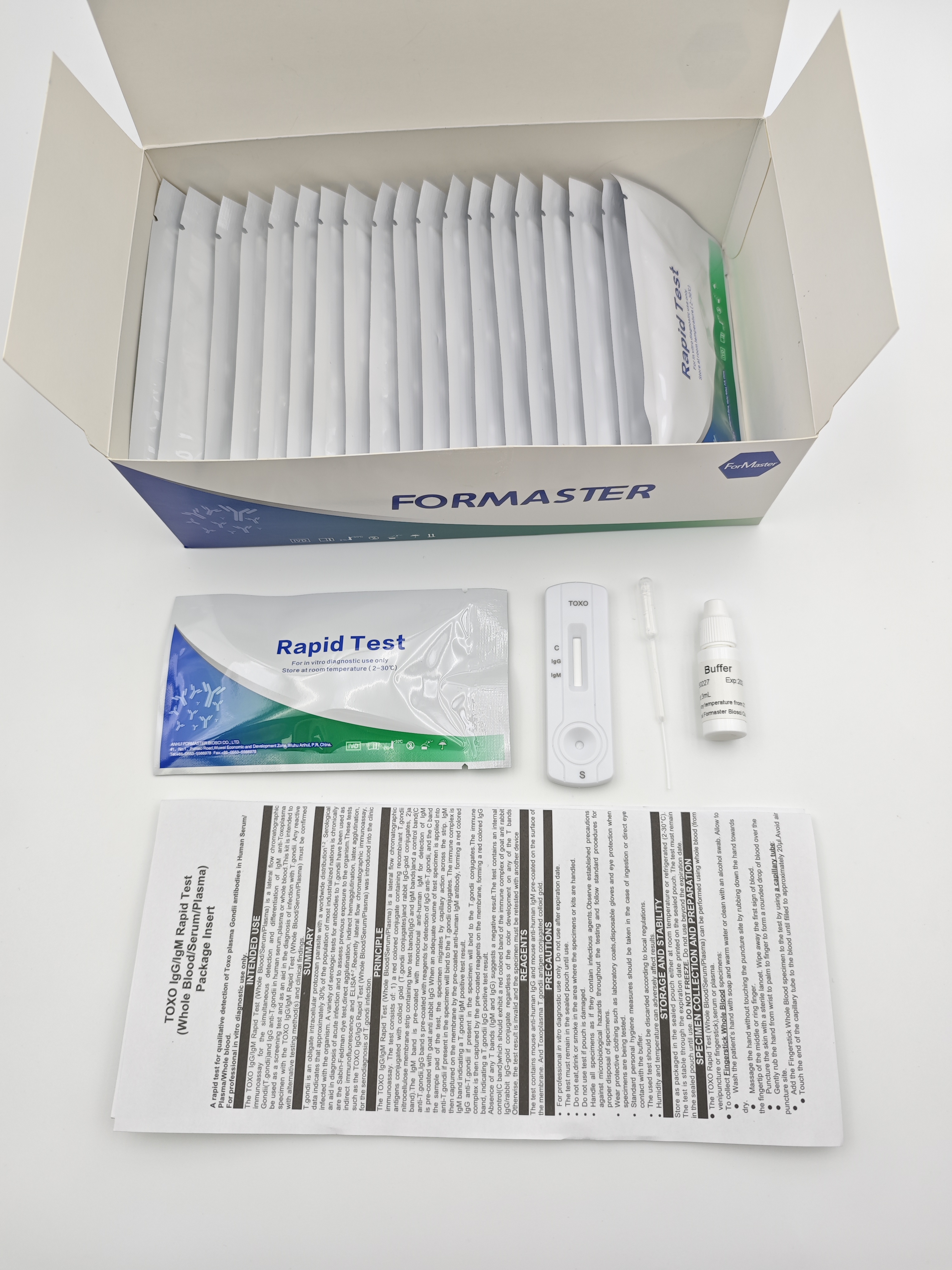 The TOXO IgG/IgM Rapid Test (Whole Blood/Plasma/Serum) is a lateral flow chromatographic immunoassay for the simultaneous detection and differentiation of IgM anti-Toxoplasma Gondii(T.gondii)and IgG anti-T.gondii in human serum,plasma or whole blood.This kit is intended to be used as a screening test and as an aid in the diagnosis of infection with T.gondii. Any reactive specimen with the TOXO IgG/IgM Rapid Test(Whole Blood/Plasma/Serum) must be confirmed with alternative testing method(s) and clinical findings.