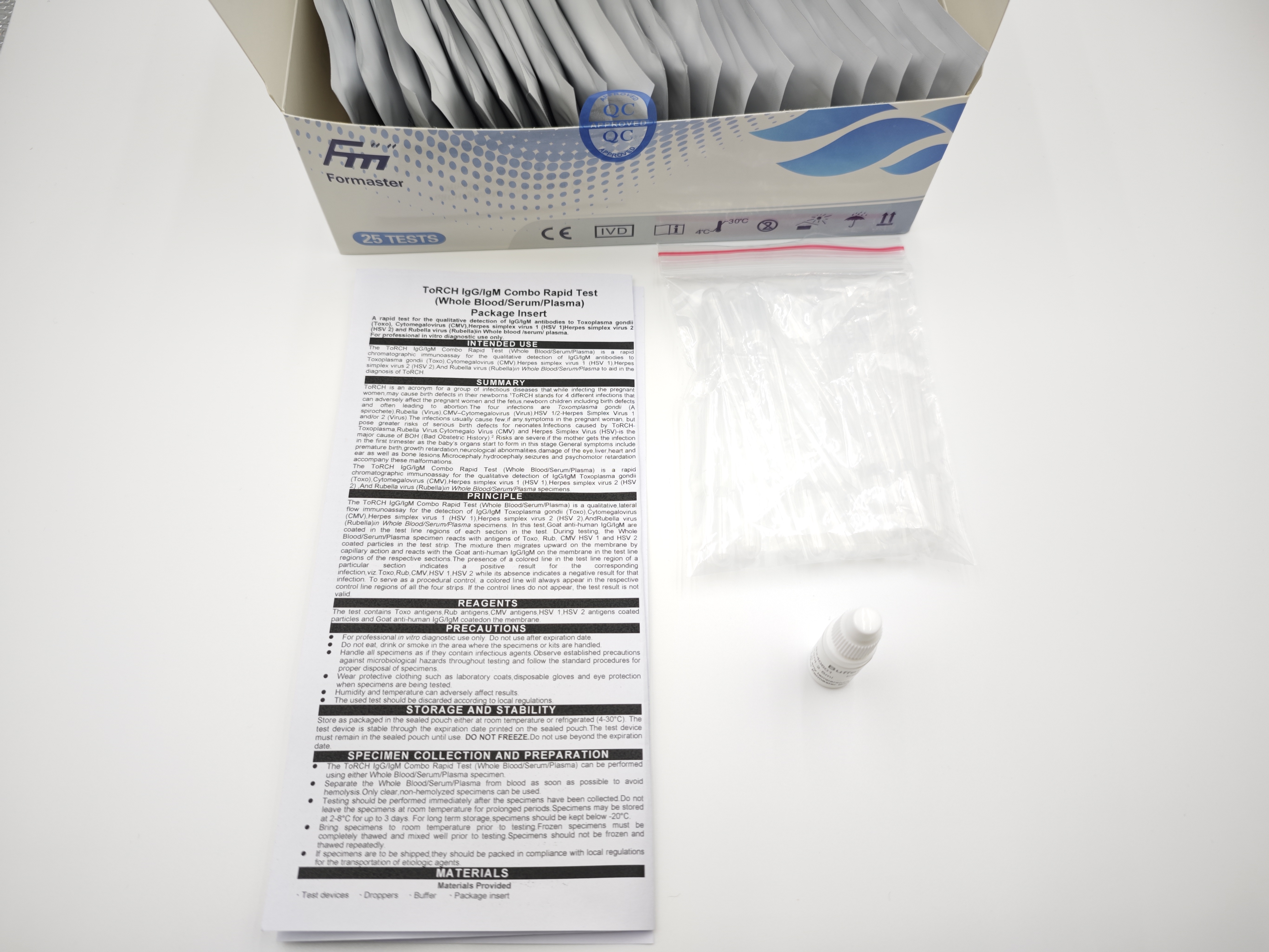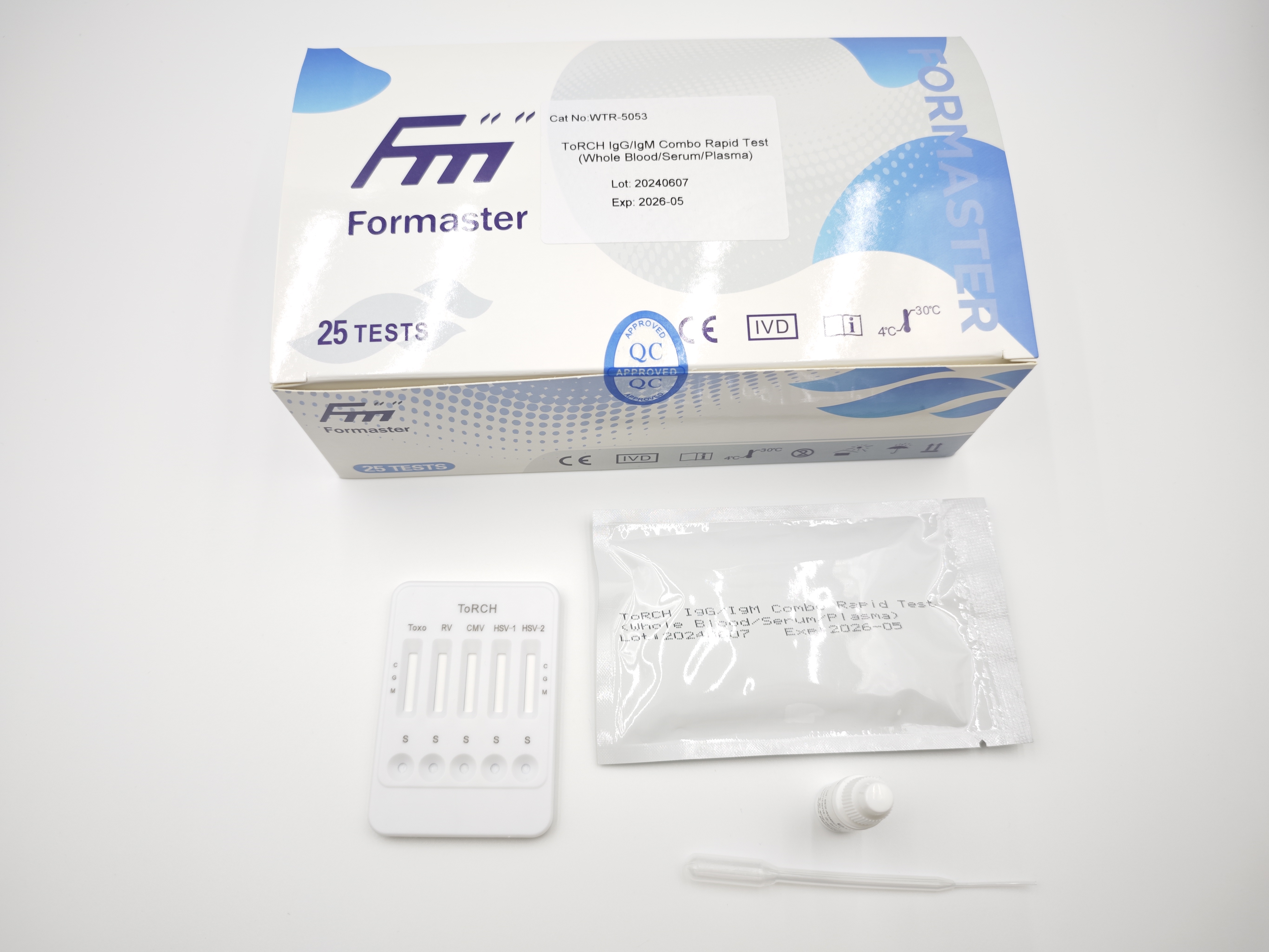 The ToRCH IgG/IgM Combo Rapid Test (Whole Blood/Serum/Plasma) is a rapid chromatographic immunoassay for the qualitative detection of IgG/IgM antibodies to Toxoplasma gondii (Toxo),Cytomegalovirus (CMV),Herpes simplex virus 1 (HSV 1),Herpes simplex virus 2 (HSV 2),And Rubella virus (Rubella)in Whole Blood/Serum/Plasma to aid in the diagnosis of ToRCH.